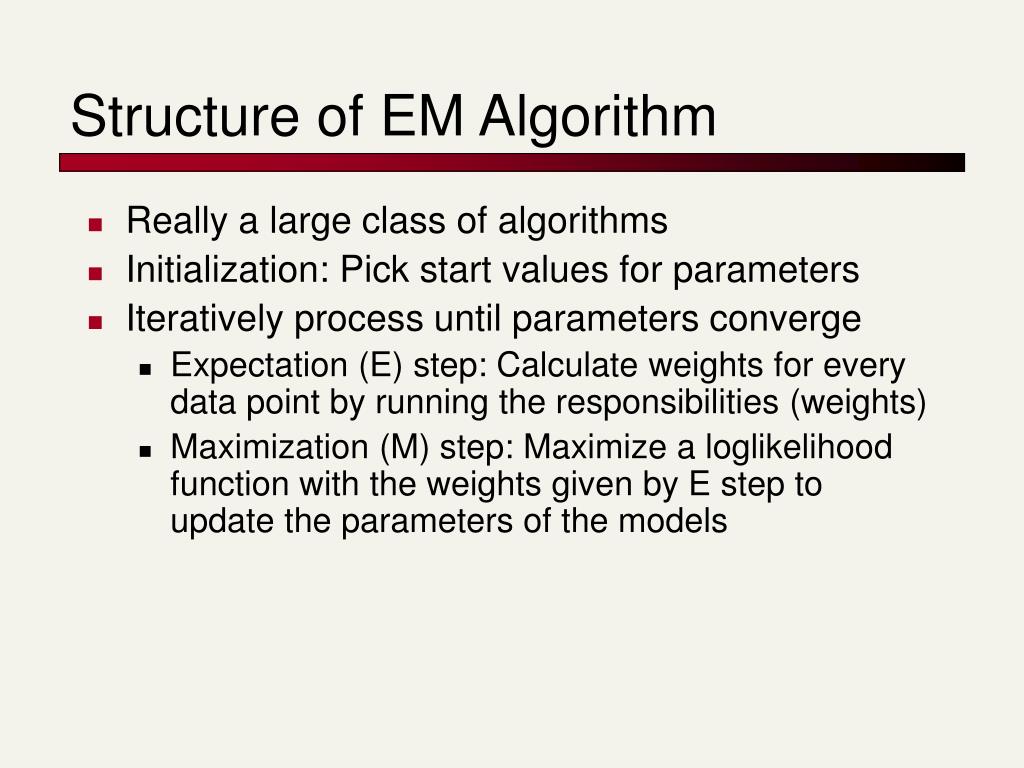 Structure of EM Algorithm • Really a large class of algorithms • Initialization: Pick start values for parameters • Iteratively process until parameters converge • Expectation (E) step: Calculate weights for every data point by running the responsibilities (weights) • Maximization (M) step: Maximize a loglikelihood function with the weights given by E step to update the parameters of the models