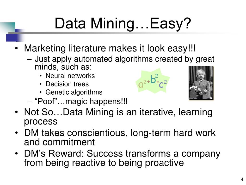 Data Mining…Easy? • Marketing literature makes it look easy!!! • Just apply automated algorithms created by great minds, such as: • Neural networks • Decision trees • Genetic algorithms • “Poof”…magic happens!!! • Not So…Data Mining is an iterative, learning process • DM takes conscientious, long-term hard work and commitment • DM’s Reward: Success transforms a company from being reactive to being proactive