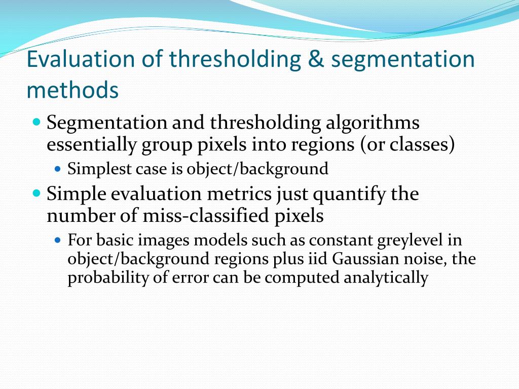 Evaluation of thresholding & segmentation methods • Segmentation and thresholding algorithms essentially group pixels into regions (or classes) • Simplest case is object/background • Simple evaluation metrics just quantify the number of miss-classified pixels • For basic images models such as constant greylevel in object/background regions plus iid Gaussian noise, the probability of error can be computed analytically