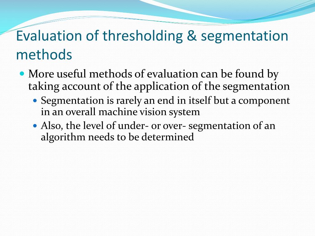 Evaluation of thresholding & segmentation methods • More useful methods of evaluation can be found by taking account of the application of the segmentation • Segmentation is rarely an end in itself but a component in an overall machine vision system • Also, the level of under- or over- segmentation of an algorithm needs to be determined