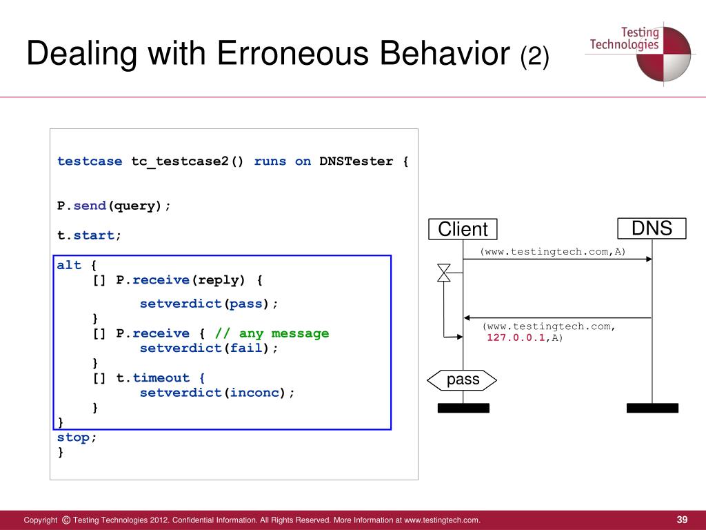 DNS (www.testingtech.com,A) (www.testingtech.com,127.0.0.1,A) fail fail fail fail inconc pass fail pass Dealing with Erroneous Behavior(2) testcase tc_testcase2() runs on DNSTester { P.send(query); t.start; alt { [] P.receive(reply) { setverdict(pass); } [] P.receive { // any message setverdict(fail); } [] t.timeout { setverdict(inconc); } } stop; } Client