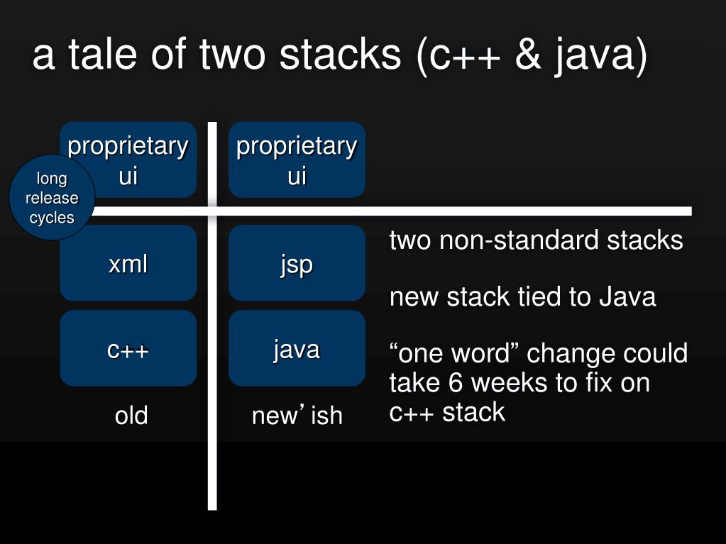 a tale of two stacks (c++ & java) • two non-standard stacks • new stack tied to Java • “one word” change could take 6 weeks to fix on c++ stack proprietary ui proprietary ui long release cycles xml jsp c++ java old new’ish