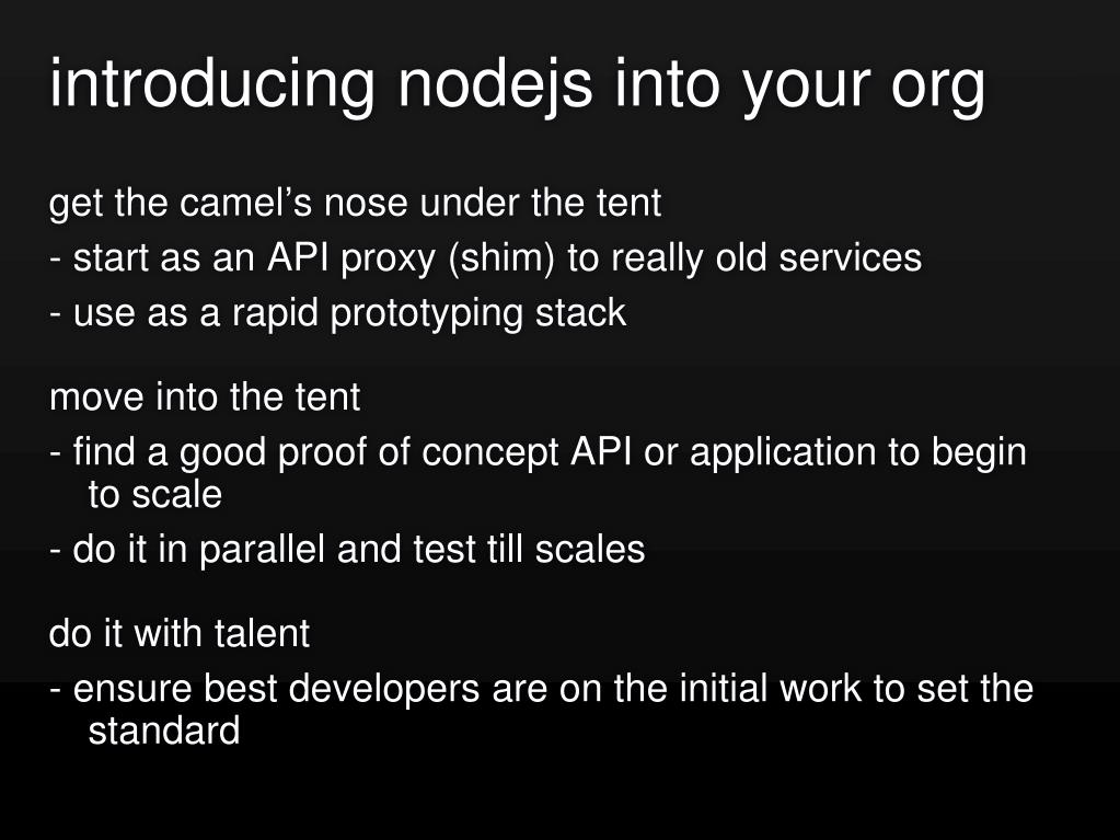 introducing nodejs into your org • get the camel’s nose under the tent • - start as an API proxy (shim) to really old services • - use as a rapid prototyping stack • move into the tent • - find a good proof of concept API or application to begin to scale • - do it in parallel and test till scales • do it with talent • - ensure best developers are on the initial work to set the standard
