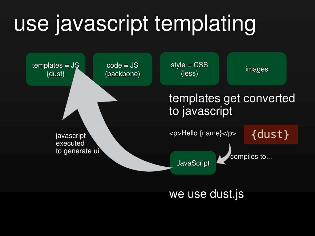 use javascript templating • templates get converted to javascript • <p>Hello {name}</p> • we use dust.js style = CSS (less) images templates = JS {dust} code = JS (backbone) • javascript executedto generate ui JavaScript • compiles to...