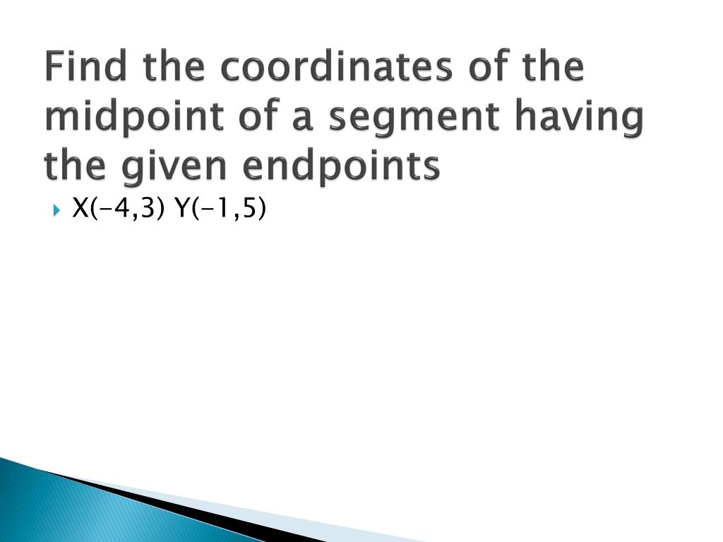 Find the coordinates of the midpoint of a segment having the given endpoints • X(-4,3) Y(-1,5)