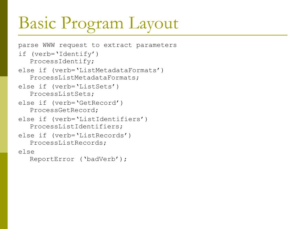 Basic Program Layout parse WWW request to extract parameters if (verb=‘Identify’) ProcessIdentify; else if (verb=‘ListMetadataFormats’) ProcessListMetadataFormats; else if (verb=‘ListSets’) ProcessListSets; else if (verb=‘GetRecord’) ProcessGetRecord; else if (verb=‘ListIdentifiers’) ProcessListIdentifiers; else if (verb=‘ListRecords’) ProcessListRecords; else ReportError (‘badVerb’);