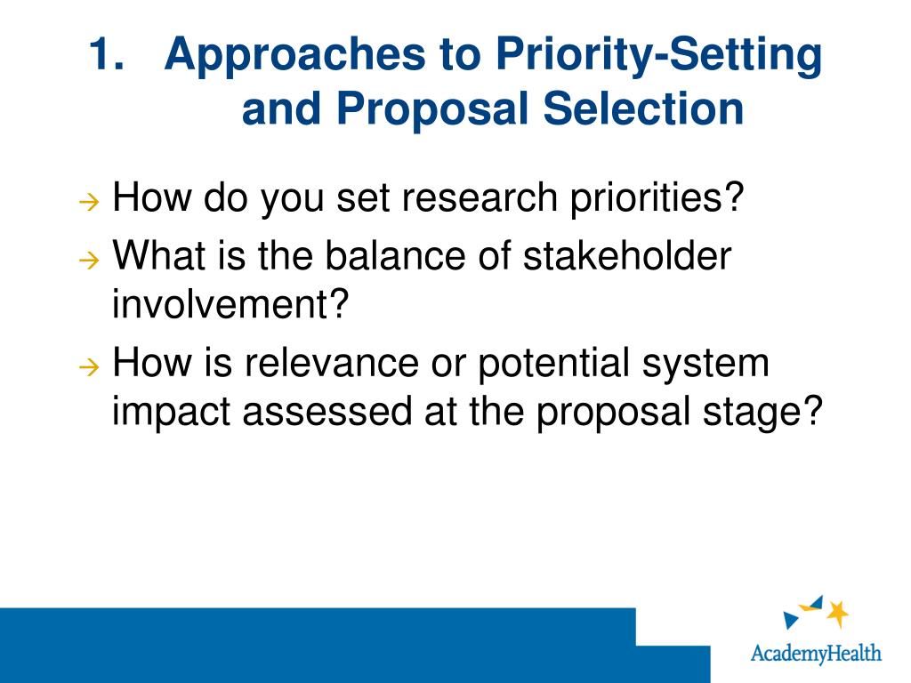 Approaches to Priority-Setting and Proposal Selection • How do you set research priorities? • What is the balance of stakeholder involvement? • How is relevance or potential system impact assessed at the proposal stage?