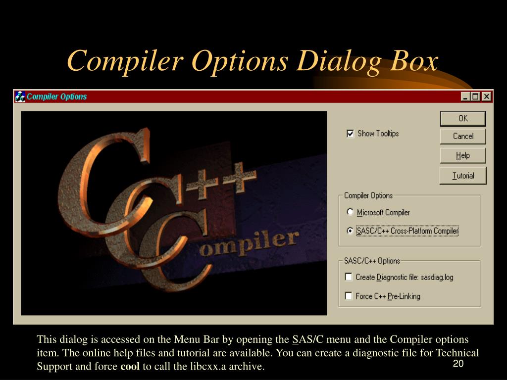 Compiler Options dialog Box Dialog box online Help and PowerPoint tutorial The Compiler Options dialog box offers the user a choice between implementing the sascc370 compiler driver, generating a pre-linked output file, and the Microsoft compiler and linker. A comprehensive diagnostic log file for use by SAS Institute Inc. Technical Support can be generated. You can force the utility cool to call the archive libcxx.a in the event that a project containing both C and C++ source files fails to do so.