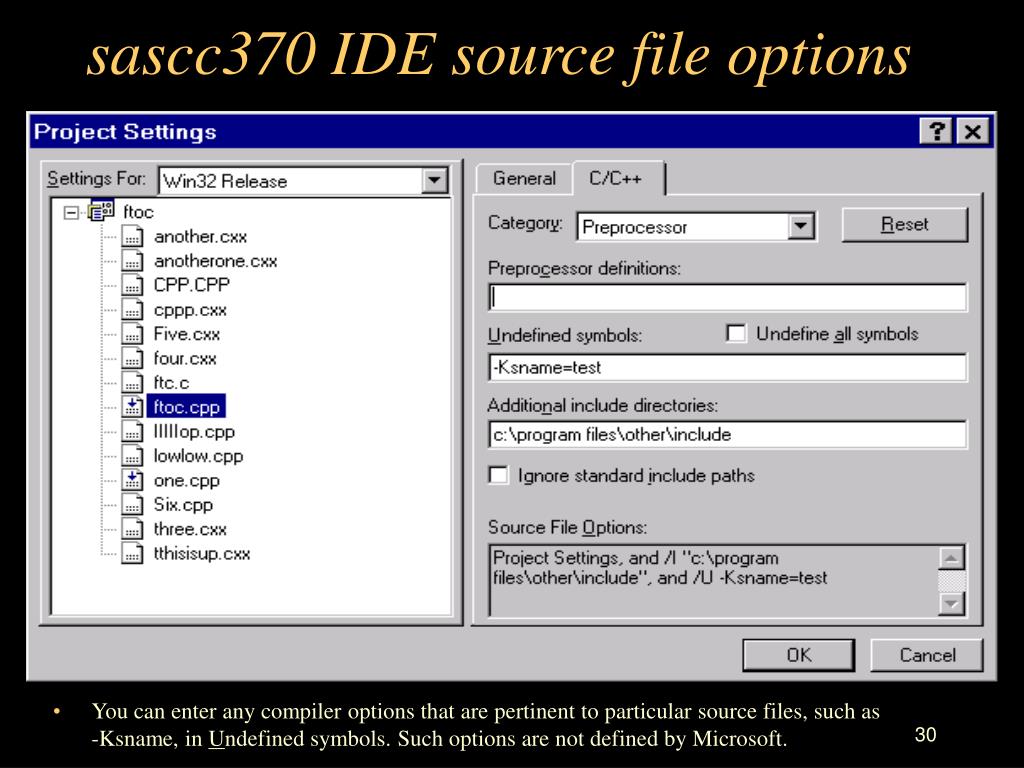 sascc370 IDE source file options • For each source file in the Settings For text box in the Project Settings dialog box, you can set options at the source file level: • Select the C/C++ tab and General from the Category drop-down menu, and enter any preprocessor definitions. • Select Preprocessor from the Category drop-down menu, and enter any additional include directories. • In the Undefined symbols text box you enter any sascc370 options for the compiler that are to be allocated to the selected source file. These driver options are not defined by the Microsoft IDE, and are only applicable to sascc370. A /U will prefix any options entered in this area when viewed in the Source File Options text box. The sascc370 driver ignores the /U, and passes any associated options to the appropriate phases of compilation. The next two slides show an example defining source file level options for ftoc.cpp. Note the additional options in the Source File Options text box.