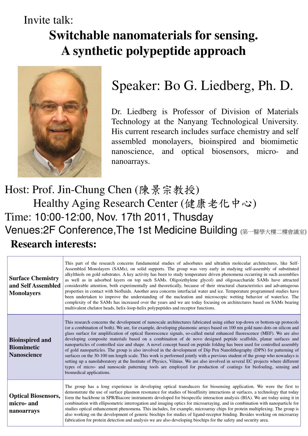 Invite talk: Switchable nanomaterials for sensing. A synthetic polypeptide approach Speaker: Bo G. Liedberg, Ph. D. Dr. Liedberg is Professor of Division of Materials Technology at the Nanyang Technological University. His current research includes surface chemistry and self assembled monolayers, bioinspired and biomimetic nanoscience, and optical biosensors, micro- and nanoarrays. Host: Prof. Jin-Chung Chen (陳景宗教授) Healthy Aging Research Center (健康老化中心) Time: 10:00-12:00, Nov. 17th 2011, Thusday Venues:2F Conference,The 1st Medicine Building(第一醫學大樓二樓會議室) Researchinterests: