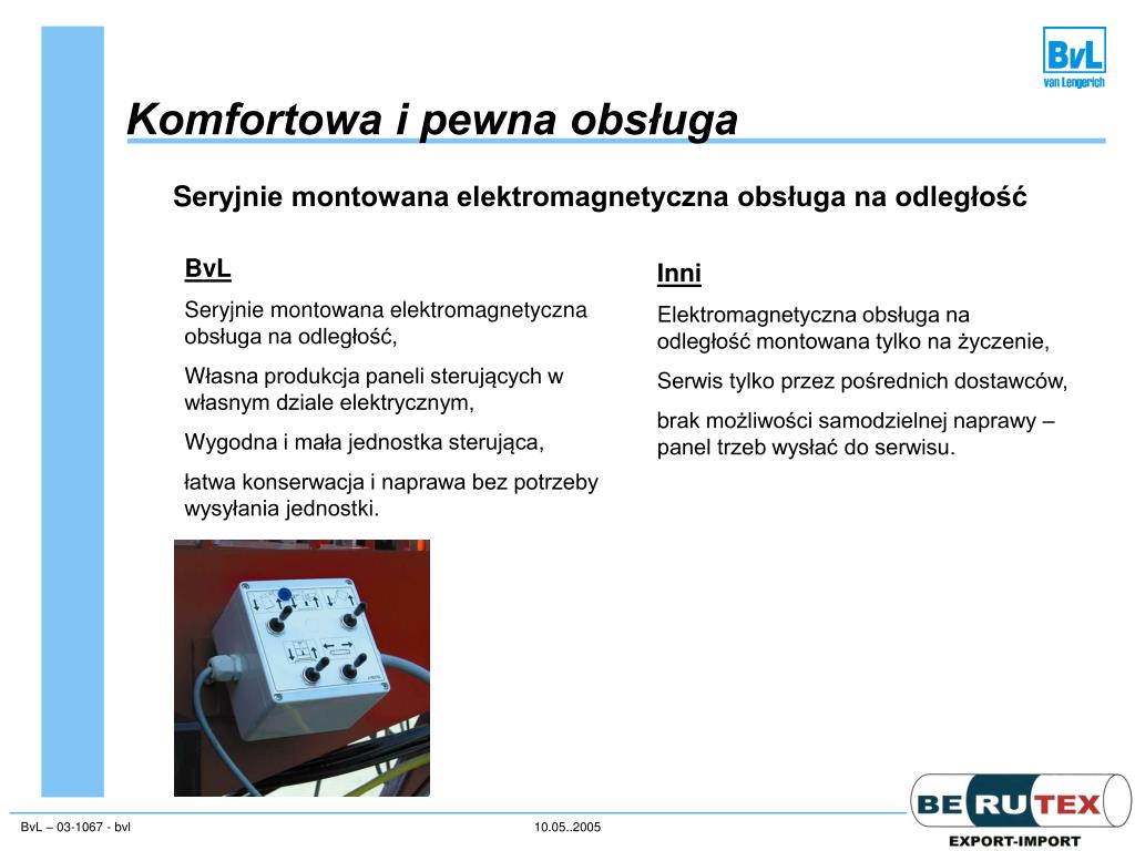 Komfortowa i pewna obsługa Seryjnie montowana elektromagnetyczna obsługa na odległość BvL Seryjnie montowana elektromagnetyczna obsługa na odległość, Własna produkcja paneli sterujących w własnym dziale elektrycznym, Wygodna i mała jednostka sterująca, łatwa konserwacja i naprawa bez potrzeby wysyłania jednostki. Inni Elektromagnetyczna obsługa na odległość montowana tylko na życzenie, Serwis tylko przez pośrednich dostawców, brak możliwości samodzielnej naprawy – panel trzeb wysłać do serwisu.