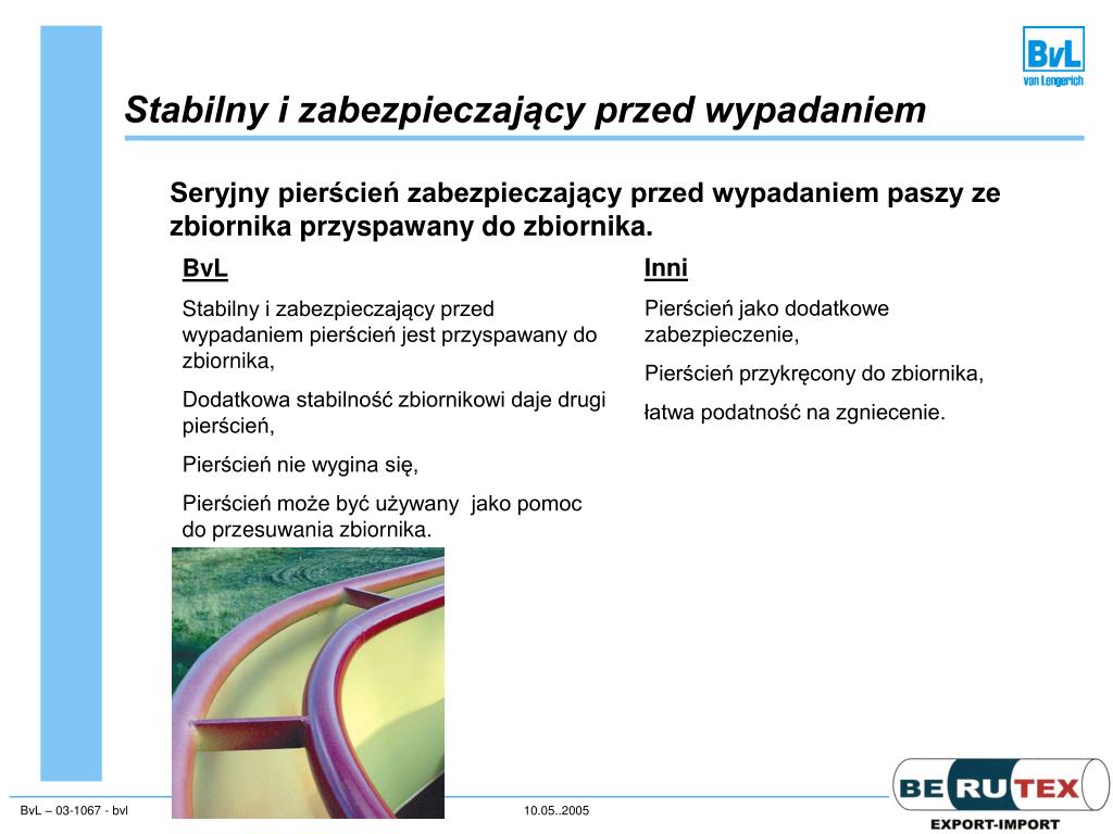 Stabilny i zabezpieczający przed wypadaniem Seryjny pierścień zabezpieczający przed wypadaniem paszy ze zbiornika przyspawany do zbiornika. Inni Pierścień jako dodatkowe zabezpieczenie, Pierścień przykręcony do zbiornika, łatwa podatność na zgniecenie. BvL Stabilny i zabezpieczający przed wypadaniem pierścień jest przyspawany do zbiornika, Dodatkowa stabilność zbiornikowi daje drugi pierścień, Pierścień nie wygina się, Pierścień może być używany jako pomoc do przesuwania zbiornika.