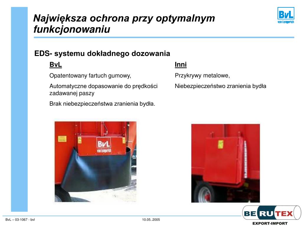 Największa ochrona przy optymalnym funkcjonowaniu EDS- systemu dokładnego dozowania Inni Przykrywy metalowe, Niebezpieczeństwo zranienia bydła BvL Opatentowany fartuch gumowy, Automatyczne dopasowanie do prędkości zadawanej paszy Brak niebezpieczeństwa zranienia bydła.
