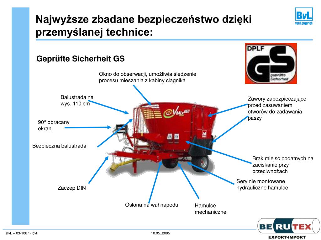 Najwyższe zbadane bezpieczeństwo dzięki przemyślanej technice: Geprüfte Sicherheit GS Okno do obserwacji, umożliwia śledzenie procesu mieszania z kabiny ciągnika Balustrada na wys. 110 cm Zawory zabezpieczające przed zasuwaniem otworów do zadawania paszy 90° obracany ekran Bezpieczna balustrada Brak miejsc podatnych na zaciskanie przy przeciwnożach Seryjnie montowane hydrauliczne hamulce Zaczep DIN Osłona na wał napedu Hamulce mechaniczne