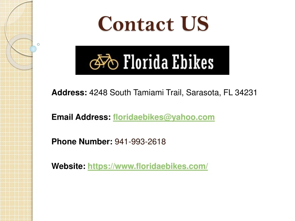 Contact US Address: 4248 South Tamiami Trail, Sarasota, FL 34231 Email Address: floridaebikes@yahoo.com Phone Number: 941-993-2618 Website: https://www.floridaebikes.com/