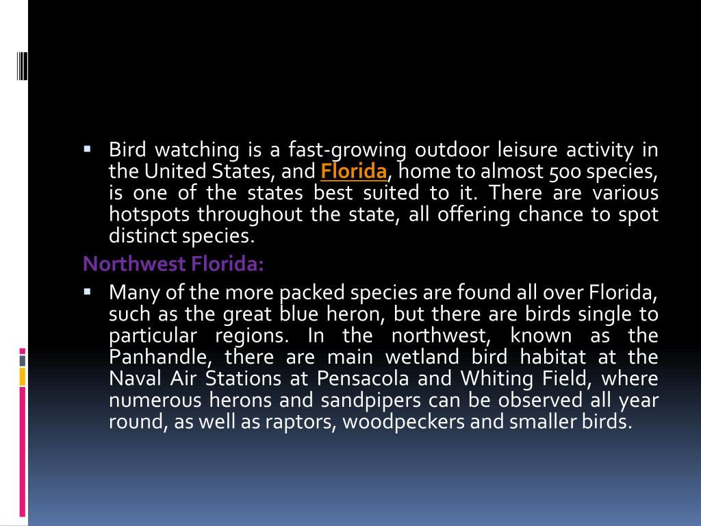Bird watching is a fast-growing outdoor leisure activity in the United States, and Florida, home to almost 500 species, is one of the states best suited to it. There are various hotspots throughout the state, all offering chance to spot distinct species. Northwest Florida: • Many of the more packed species are found all over Florida, such as the great blue heron, but there are birds single to particular regions. In the northwest, known as the Panhandle, there are main wetland bird habitat at the Naval Air Stations at Pensacola and Whiting Field, where numerous herons and sandpipers can be observed all year round, as well as raptors, woodpeckers and smaller birds.