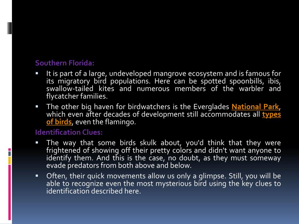 Southern Florida: • It is part of a large, undeveloped mangrove ecosystem and is famous for its migratory bird populations. Here can be spotted spoonbills, ibis, swallow-tailed kites and numerous members of the warbler and flycatcher families. • The other big haven for birdwatchers is the Everglades National Park, which even after decades of development still accommodates all types of birds, even the flamingo. Identification Clues: • The way that some birds skulk about, you'd think that they were frightened of showing off their pretty colors and didn't want anyone to identify them. And this is the case, no doubt, as they must someway evade predators from both above and below. • Often, their quick movements allow us only a glimpse. Still, you will be able to recognize even the most mysterious bird using the key clues to identification described here.