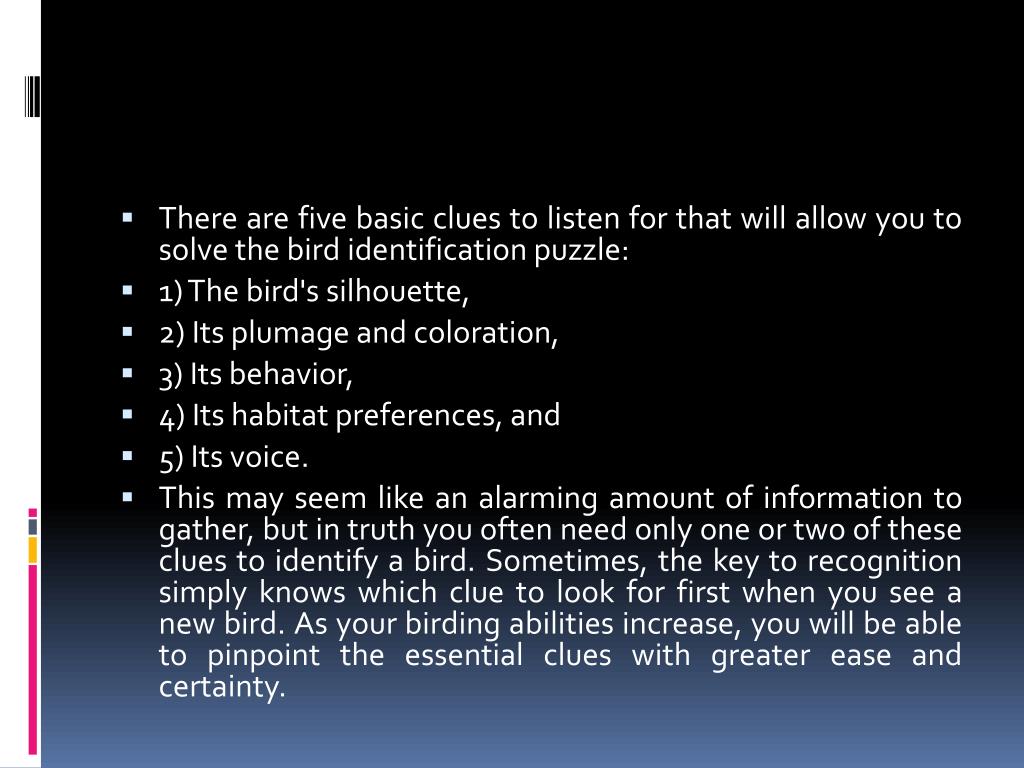 There are five basic clues to listen for that will allow you to solve the bird identification puzzle: • 1) The bird's silhouette, • 2) Its plumage and coloration, • 3) Its behavior, • 4) Its habitat preferences, and • 5) Its voice. • This may seem like an alarming amount of information to gather, but in truth you often need only one or two of these clues to identify a bird. Sometimes, the key to recognition simply knows which clue to look for first when you see a new bird. As your birding abilities increase, you will be able to pinpoint the essential clues with greater ease and certainty.