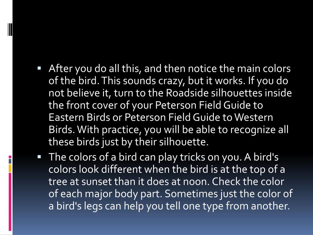After you do all this, and then notice the main colors of the bird. This sounds crazy, but it works. If you do not believe it, turn to the Roadside silhouettes inside the front cover of your Peterson Field Guide to Eastern Birds or Peterson Field Guide to Western Birds. With practice, you will be able to recognize all these birds just by their silhouette. • The colors of a bird can play tricks on you. A bird's colors look different when the bird is at the top of a tree at sunset than it does at noon. Check the color of each major body part. Sometimes just the color of a bird's legs can help you tell one type from another.