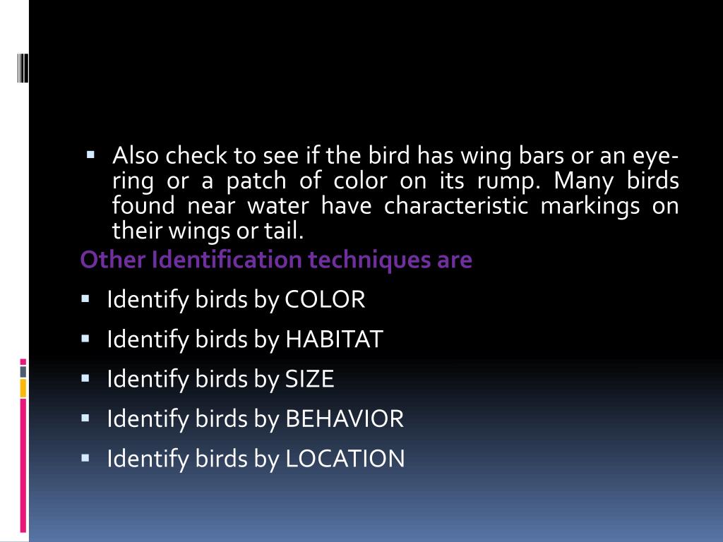 Also check to see if the bird has wing bars or an eye-ring or a patch of color on its rump. Many birds found near water have characteristic markings on their wings or tail. Other Identification techniques are • Identify birds by COLOR • Identify birds by HABITAT • Identify birds by SIZE • Identify birds by BEHAVIOR • Identify birds by LOCATION