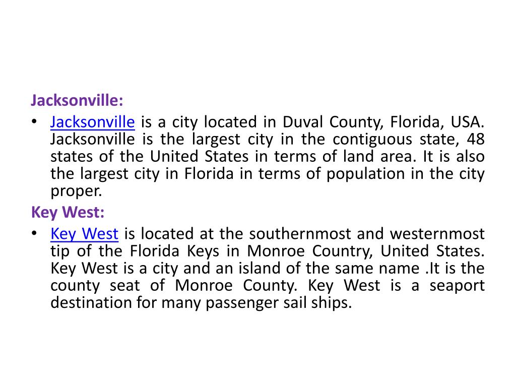 Jacksonville: • Jacksonville is a city located in Duval County, Florida, USA. Jacksonville is the largest city in the contiguous state, 48 states of the United States in terms of land area. It is also the largest city in Florida in terms of population in the city proper. Key West: • Key West is located at the southernmost and westernmost tip of the Florida Keys in Monroe Country, United States. Key West is a city and an island of the same name .It is the county seat of Monroe County. Key West is a seaport destination for many passenger sail ships.