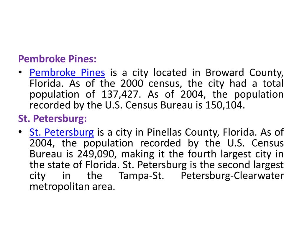 Pembroke Pines: • Pembroke Pines is a city located in Broward County, Florida. As of the 2000 census, the city had a total population of 137,427. As of 2004, the population recorded by the U.S. Census Bureau is 150,104. St. Petersburg: • St. Petersburg is a city in Pinellas County, Florida. As of 2004, the population recorded by the U.S. Census Bureau is 249,090, making it the fourth largest city in the state of Florida. St. Petersburg is the second largest city in the Tampa-St. Petersburg-Clearwater metropolitan area.