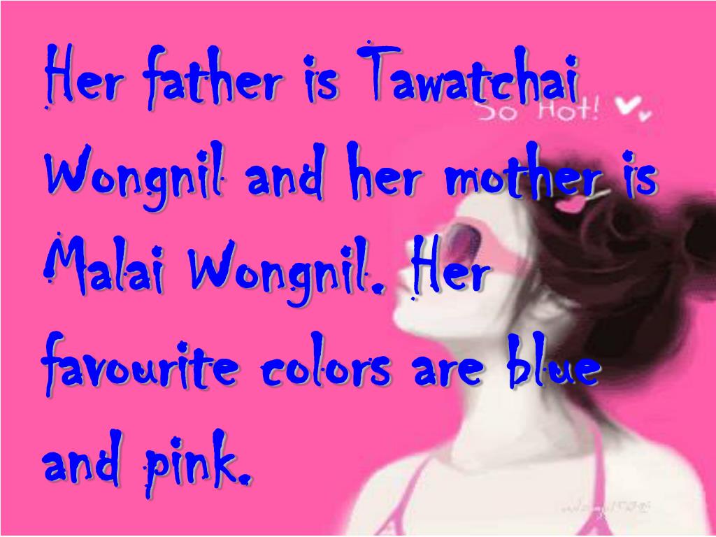 Her father is Tawatchai Wongnil and her mother is Malai Wongnil. Her favourite colors are blue and pink.