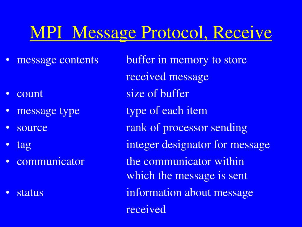 MPI Message Protocol, Receive • message contents buffer in memory to store received message • count size of buffer • message type type of each item • source rank of processor sending • tag integer designator for message • communicator the communicator within which the message is sent • status information about message received
