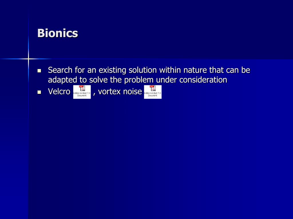 Bionics • Search for an existing solution within nature that can be adapted to solve the problem under consideration • Velcro , vortex noise