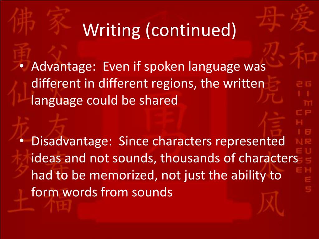 Writing (continued) • Advantage: Even if spoken language was different in different regions, the written language could be shared • Disadvantage: Since characters represented ideas and not sounds, thousands of characters had to be memorized, not just the ability to form words from sounds