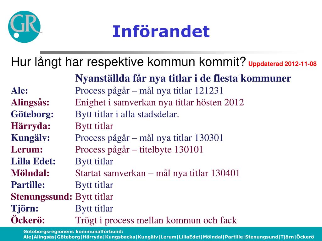 Införandet Hur långt har respektive kommun kommit?Uppdaterad 2012-11-08 Nyanställda får nya titlar i de flesta kommuner Ale: Process pågår – mål nya titlar 121231 Alingsås: Enighet i samverkan nya titlar hösten 2012 Göteborg:Bytt titlar i alla stadsdelar. Härryda:Bytt titlar Kungälv: Process pågår – mål nya titlar 130301 Lerum: Process pågår – titelbyte 130101 Lilla Edet:Bytt titlar Mölndal: Startat samverkan – mål nya titlar 130401 Partille: Bytt titlar Stenungssund:Bytt titlar Tjörn: Bytt titlar Öckerö: Trögt i process mellan kommun och fack
