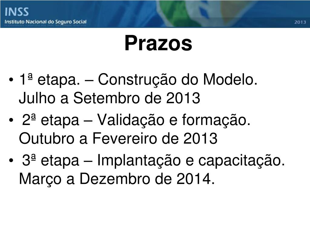 Prazos 1ª etapa. – Construção do Modelo. Julho a Setembro de 2013 2ª etapa – Validação e formação. Outubro a Fevereiro de 2013 3ª etapa – Implantação e capacitação. Março a Dezembro de 2014.