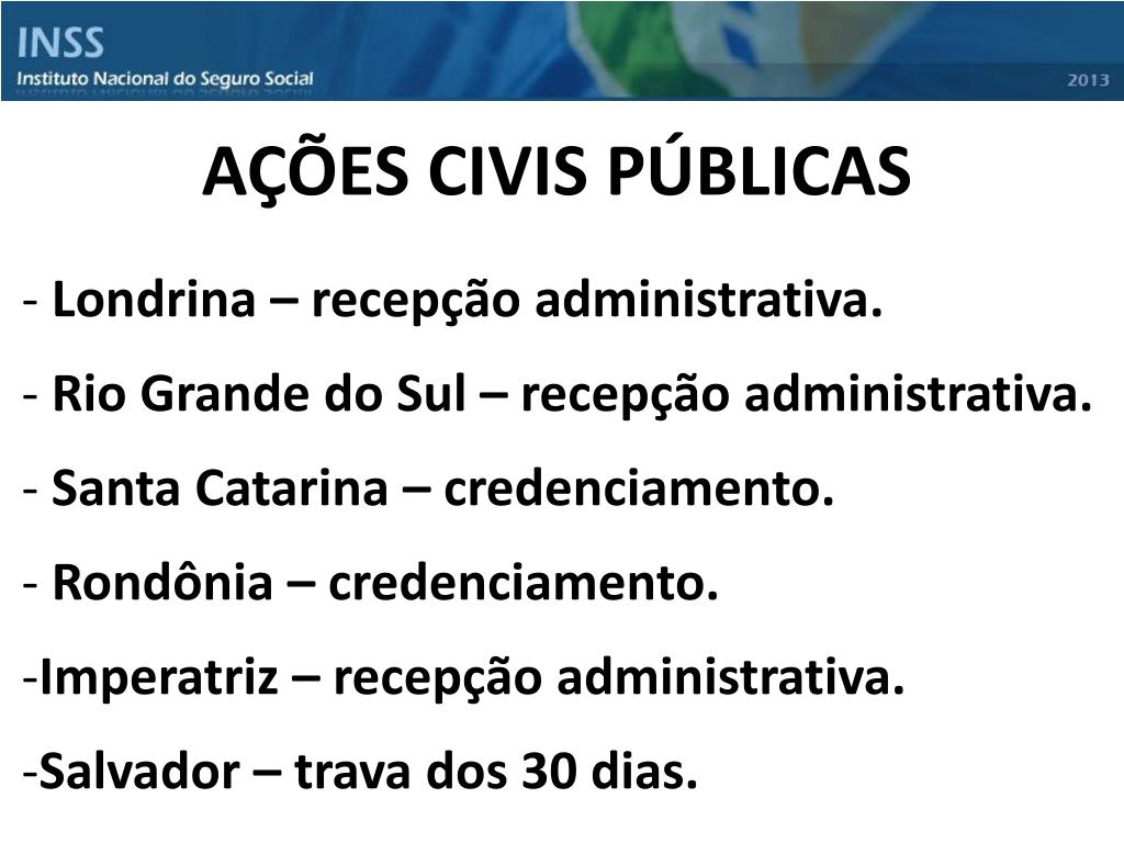AÇÕES CIVIS PÚBLICAS • Londrina – recepção administrativa. • Rio Grande do Sul – recepção administrativa. • Santa Catarina – credenciamento. • Rondônia – credenciamento. • Imperatriz – recepção administrativa. • Salvador – trava dos 30 dias.
