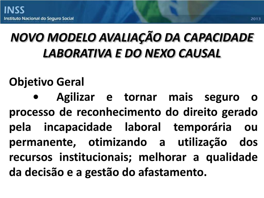 NOVO MODELO AVALIAÇÃO DA CAPACIDADE LABORATIVA E DO NEXO CAUSAL Objetivo Geral • Agilizar e tornar mais seguro o processo de reconhecimento do direito gerado pela incapacidade laboral temporária ou permanente, otimizando a utilização dos recursos institucionais; melhorar a qualidade da decisão e a gestão do afastamento.