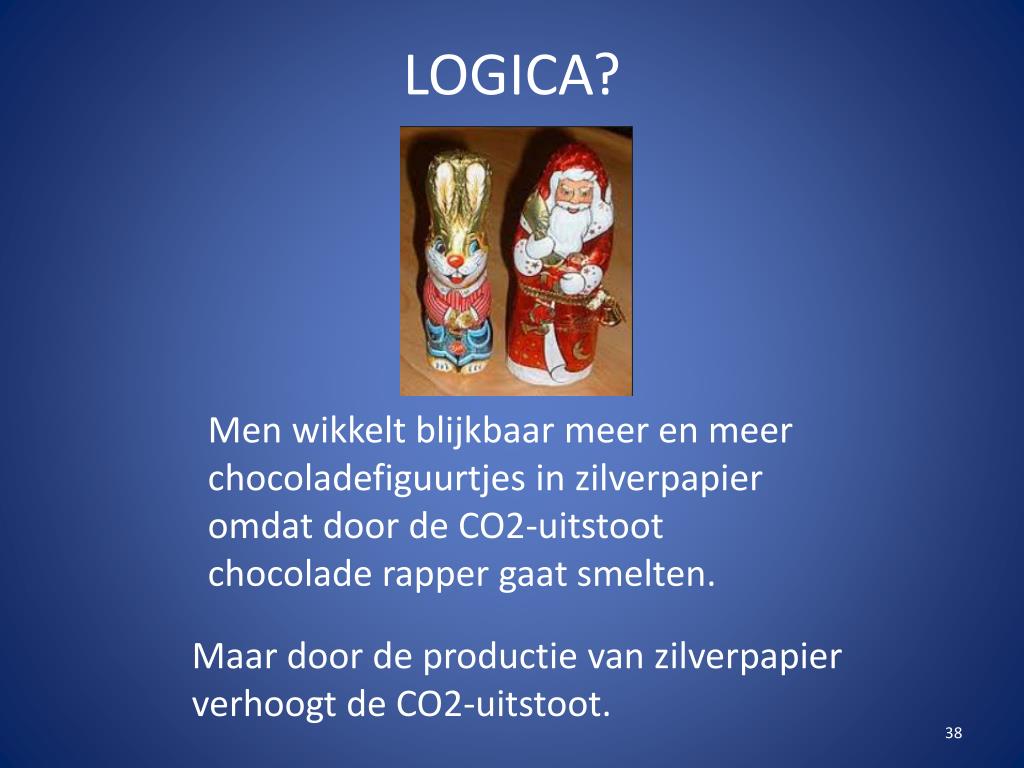 LOGICA? Men wikkelt blijkbaar meer en meer chocoladefiguurtjes in zilverpapier omdat door de CO2-uitstoot chocolade rapper gaat smelten. Maar door de productie van zilverpapier verhoogt de CO2-uitstoot.