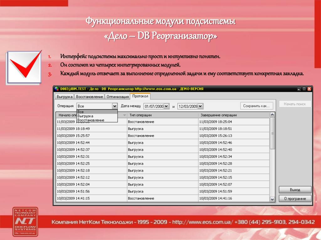 Подсистема «Дело- DB Реорганизатор» для Системы «ДЕЛО». Неограниченный простор для реорганизации БД. Киев 1995-2009. Назначение подсистемы «Дело – DB Реорганизатор».