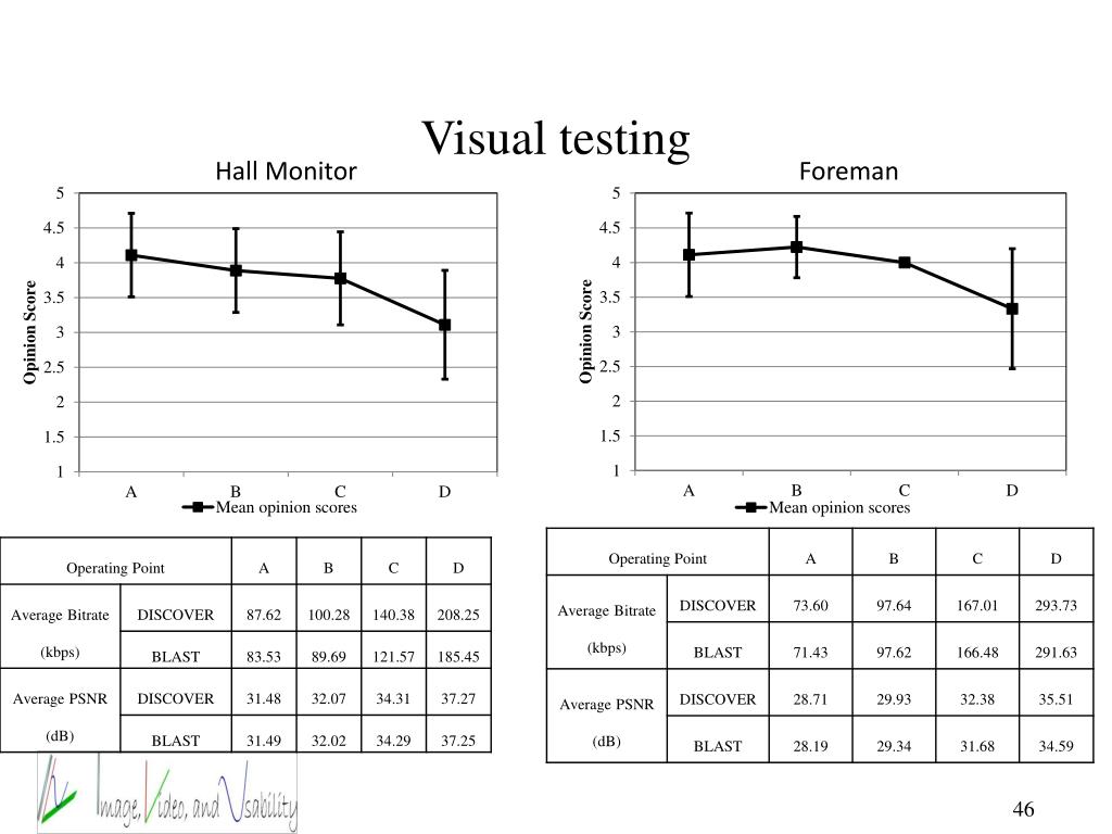 Visual Testing Setup 9 subjects took the test. Two video sequences are randomly placed side by side on a 19” Dell Ultrasharp screen. Score • 1: DISCOVER is much better than BLAST DVC • 2: DISCOVER is better than BLAST DVC • 3: same quality • 4: DISCOVER is worse than BLAST DVC • 5: DISCOVER is much worse than BLAST DVC