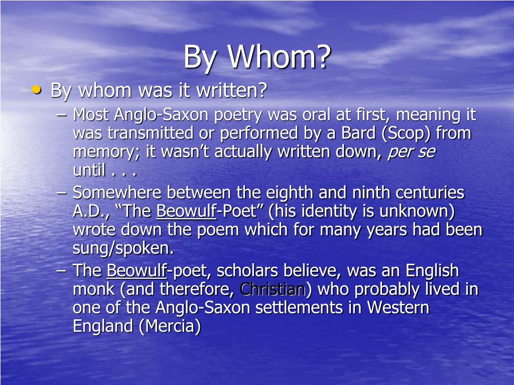 By Whom? • By whom was it written? • Most Anglo-Saxon poetry was oral at first, meaning it was transmitted or performed by a Bard (Scop) from memory; it wasn’t actually written down, per se until . . . • Somewhere between the eighth and ninth centuries A.D., “The Beowulf-Poet” (his identity is unknown) wrote down the poem which for many years had been sung/spoken. • The Beowulf-poet, scholars believe, was an English monk (and therefore, Christian) who probably lived in one of the Anglo-Saxon settlements in Western England (Mercia)