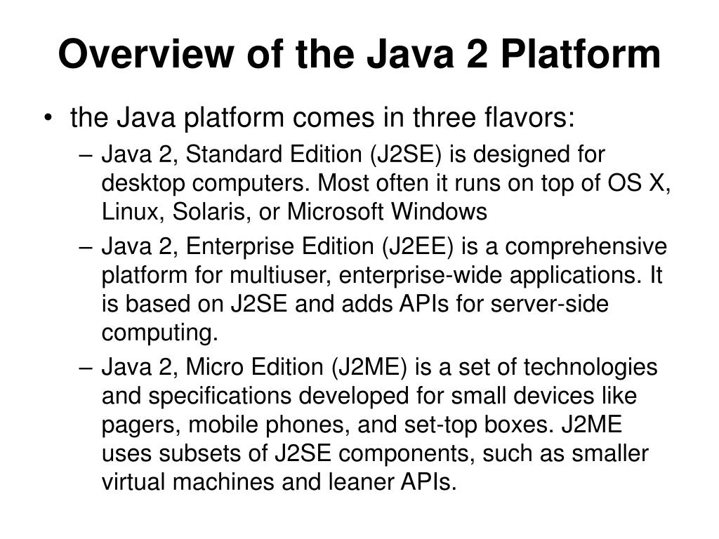 Overview of the Java 2 Platform • the Java platform comes in three flavors: • Java 2, Standard Edition (J2SE) is designed for desktop computers. Most often it runs on top of OS X, Linux, Solaris, or Microsoft Windows • Java 2, Enterprise Edition (J2EE) is a comprehensive platform for multiuser, enterprise-wide applications. It is based on J2SE and adds APIs for server-side computing. • Java 2, Micro Edition (J2ME) is a set of technologies and specifications developed for small devices like pagers, mobile phones, and set-top boxes. J2ME uses subsets of J2SE components, such as smaller virtual machines and leaner APIs.