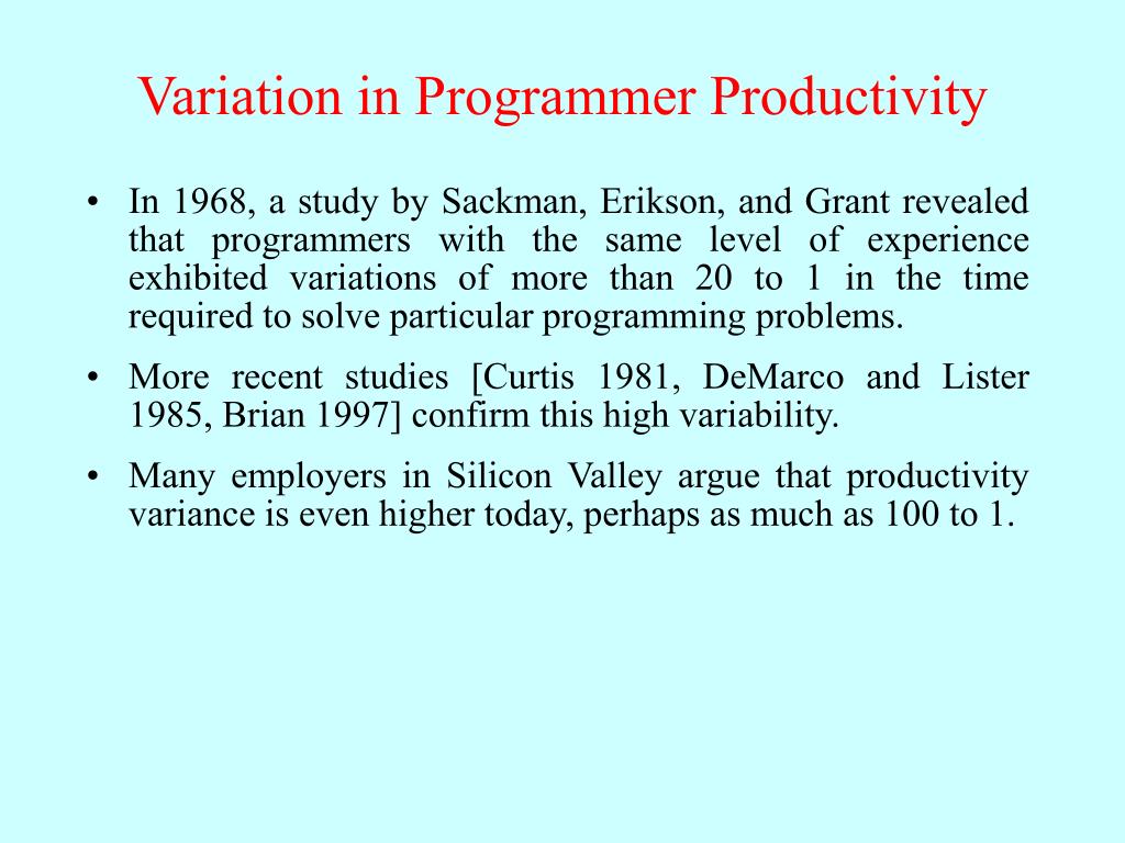 Variation in Programmer Productivity • In 1968, a study by Sackman, Erikson, and Grant revealed that programmers with the same level of experience exhibited variations of more than 20 to 1 in the time required to solve particular programming problems. • More recent studies [Curtis 1981, DeMarco and Lister 1985, Brian 1997] confirm this high variability. • Many employers in Silicon Valley argue that productivity variance is even higher today, perhaps as much as 100 to 1.