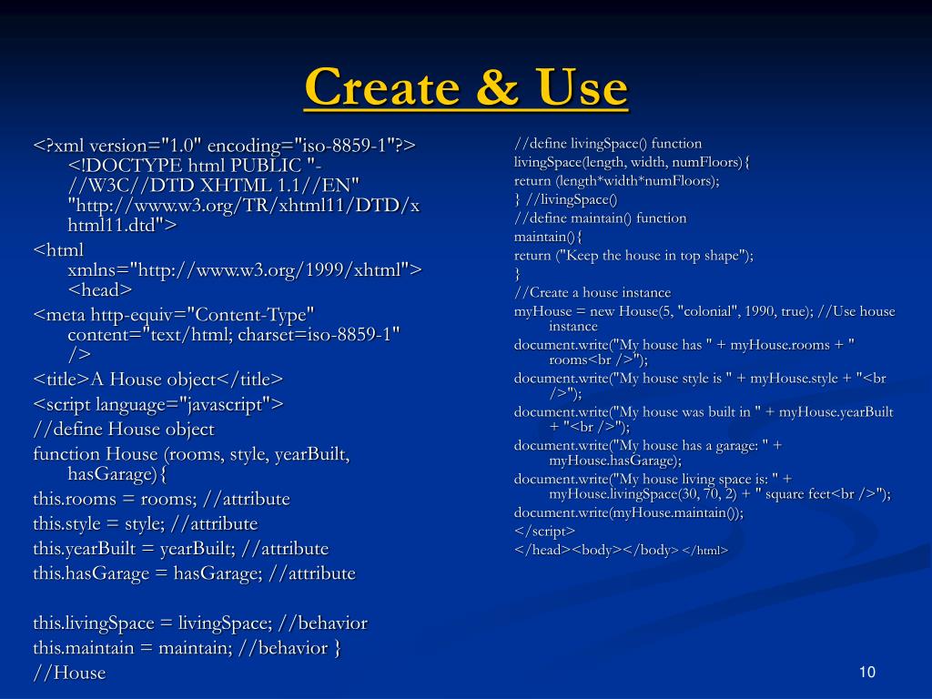 <?xml version="1.0" encoding="iso-8859-1"?> <!DOCTYPE html PUBLIC "-//W3C//DTD XHTML 1.1//EN" "http://www.w3.org/TR/xhtml11/DTD/xhtml11.dtd"> <html xmlns="http://www.w3.org/1999/xhtml"> <head> <meta http-equiv="Content-Type" content="text/html; charset=iso-8859-1" /> <title>A House object</title> <script language="javascript"> //define House object function House (rooms, style, yearBuilt, hasGarage){ this.rooms = rooms; //attribute this.style = style; //attribute this.yearBuilt = yearBuilt; //attribute this.hasGarage = hasGarage; //attribute this.livingSpace = livingSpace; //behavior this.maintain = maintain; //behavior } //House //define livingSpace() function livingSpace(length, width, numFloors){ return (length*width*numFloors); } //livingSpace() //define maintain() function maintain(){ return ("Keep the house in top shape"); } //Create a house instance myHouse = new House(5, "colonial", 1990, true); //Use house instance document.write("My house has " + myHouse.rooms + " rooms<br />"); document.write("My house style is " + myHouse.style + "<br />"); document.write("My house was built in " + myHouse.yearBuilt + "<br />"); document.write("My house has a garage: " + myHouse.hasGarage); document.write("My house living space is: " + myHouse.livingSpace(30, 70, 2) + " square feet<br />"); document.write(myHouse.maintain()); </script> </head><body></body> </html> Create & Use
