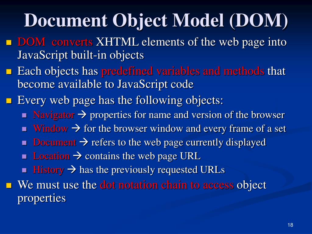 Document Object Model (DOM) • DOM converts XHTML elements of the web page into JavaScript built-in objects • Each objects has predefined variables and methods that become available to JavaScript code • Every web page has the following objects: • Navigator properties for name and version of the browser • Window for the browser window and every frame of a set • Document refers to the web page currently displayed • Location contains the web page URL • History has the previously requested URLs • We must use the dot notation chain to access object properties