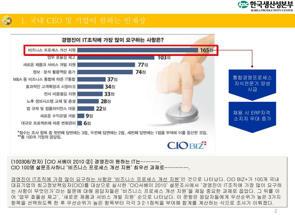 1. 국내 CEO 및 기업이 원하는 인재상. 통합경영프로세스 지식전문가 양성 시급. 채용 시 ERP 자격 소지자 우대 증가. (100308/ 전자 ) [CIO 서베이 2010 ②] 경영진이 원하는 IT 는 …………. CIO 100 명 설문조사하니 ‘비즈니스 프로세스 개선 지원’ 최우선 과제로 …………….