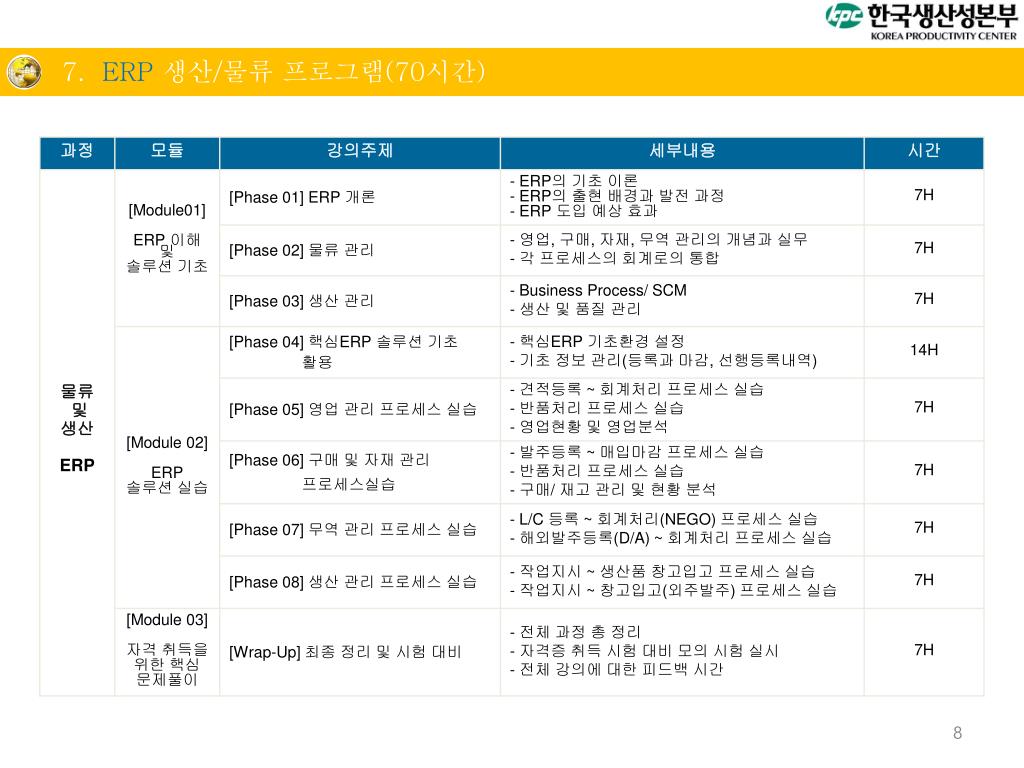 2. 국내·외 환경의 변화 시시각각 변하는 비즈니스 세계에서의 성공전략은 타이밍 지금, 대한민국 기업의 시계는 ERP 에 맞춰져 있습니다! ERP 한국생산성본부 구인·구직 사이트 운용 www.kpcerp.or.kr 사베인스옥슬리법(SOX), 국제회계기준(IFRS), 교토의정서와 같이 회계 및 외부요인 등 환경규제갈수록 심화… 기업 내 회계/인사/생산/ 물류등 각 부문별로 산재된 기업정보 시스템을 통합적으로관리/운용할 수 있는 실무인력 수요 증가…