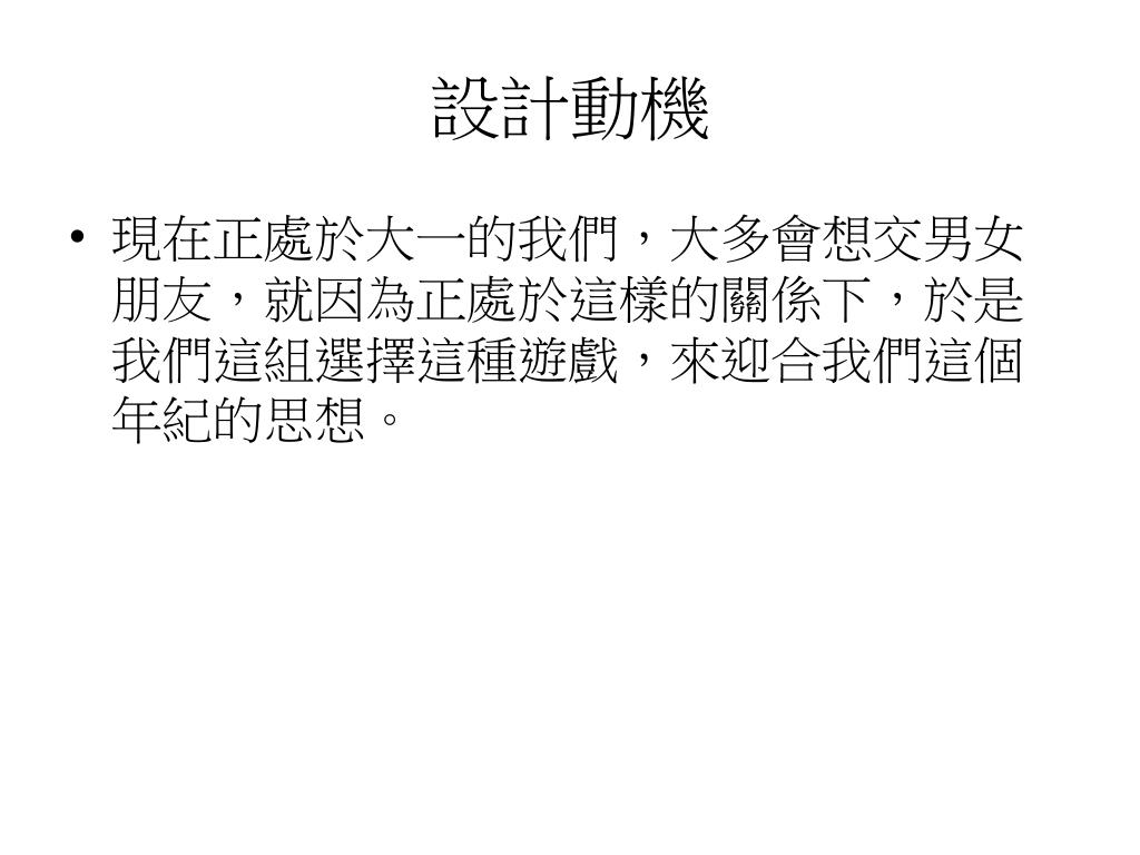 設計動機 • 現在正處於大一的我們,大多會想交男女朋友,就因為正處於這樣的關係下,於是我們這組選擇這種遊戲,來迎合我們這個年紀的思想。