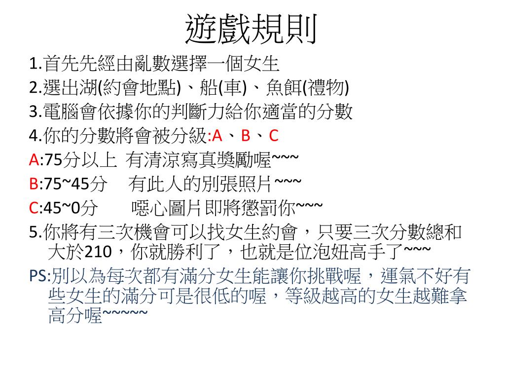 遊戲規則 1.首先先經由亂數選擇一個女生 2.選出湖(約會地點)、船(車)、魚餌(禮物) 3.電腦會依據你的判斷力給你適當的分數 4.你的分數將會被分級:A、B、C A:75分以上 有清涼寫真獎勵喔~~~ B:75~45分 有此人的別張照片~~~ C:45~0分 噁心圖片即將懲罰你~~~ 5.你將有三次機會可以找女生約會,只要三次分數總和大於210,你就勝利了,也就是位泡妞高手了~~~ PS:別以為每次都有滿分女生能讓你挑戰喔,運氣不好有些女生的滿分可是很低的喔,等級越高的女生越難拿高分喔~~~~~