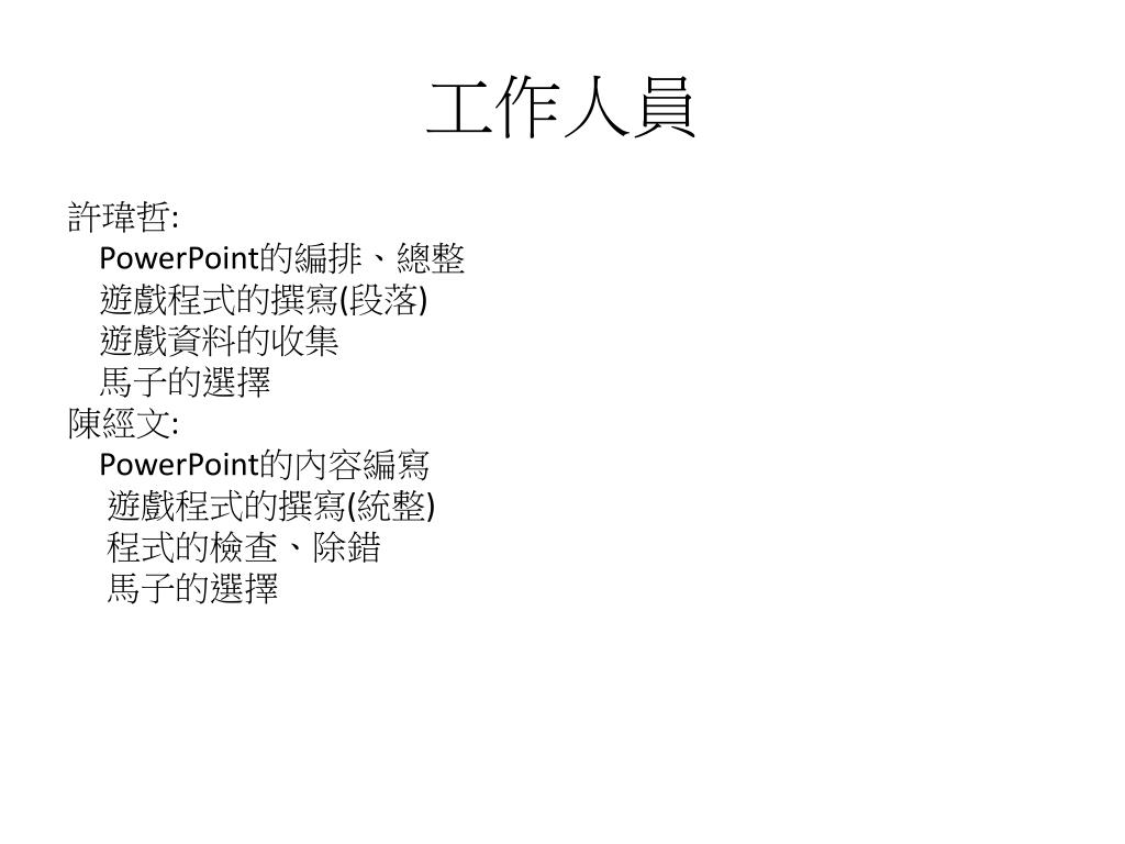 工作人員 許瑋哲: PowerPoint的編排、總整 遊戲程式的撰寫(段落) 遊戲資料的收集 馬子的選擇 陳經文: PowerPoint的內容編寫 遊戲程式的撰寫(統整) 程式的檢查、除錯 馬子的選擇