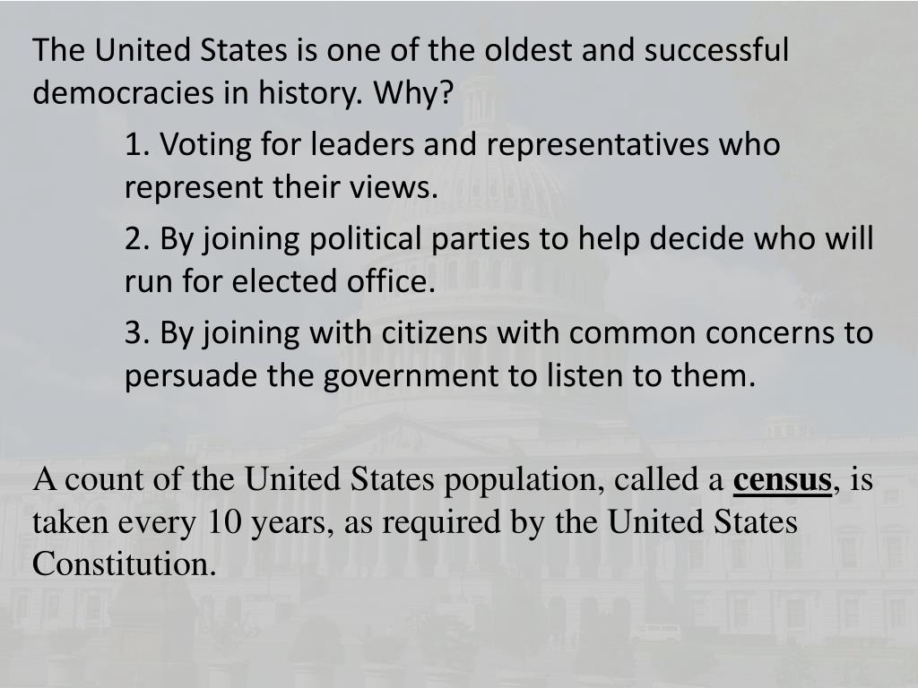 The United States is one of the oldest and successful democracies in history. Why? 1. Voting for leaders and representatives who represent their views. 2. By joining political parties to help decide who will run for elected office. 3. By joining with citizens with common concerns to persuade the government to listen to them. A count of the United States population, called a census, is taken every 10 years, as required by the United States Constitution.