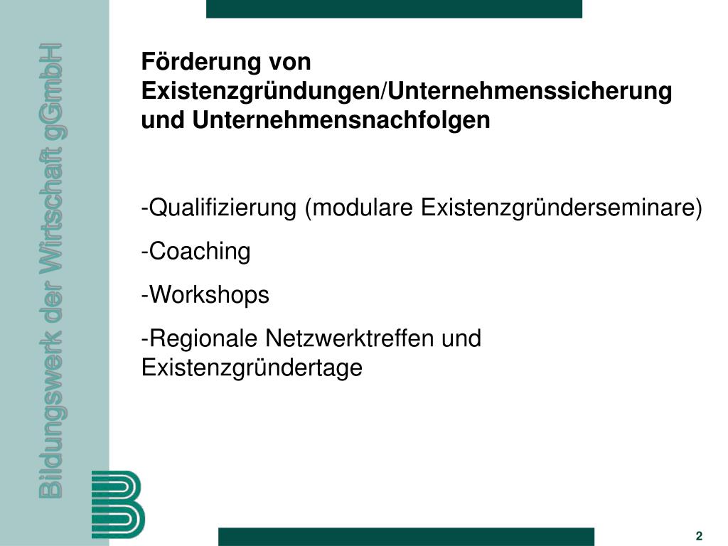 Förderung von Existenzgründungen/Unternehmenssicherung und Unternehmensnachfolgen • Qualifizierung (modulare Existenzgründerseminare) • Coaching • Workshops • Regionale Netzwerktreffen und Existenzgründertage