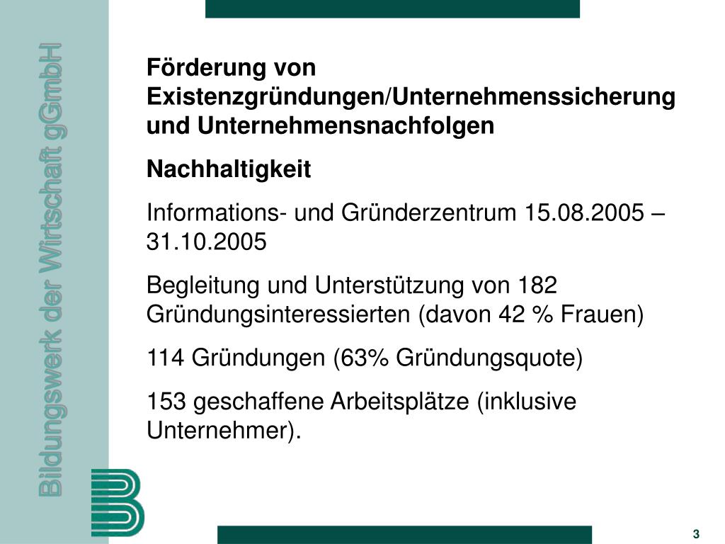 Förderung von Existenzgründungen/Unternehmenssicherung und Unternehmensnachfolgen Nachhaltigkeit Informations- und Gründerzentrum 15.08.2005 – 31.10.2005 Begleitung und Unterstützung von 182 Gründungsinteressierten (davon 42 % Frauen) 114 Gründungen (63% Gründungsquote) 153 geschaffene Arbeitsplätze (inklusive Unternehmer).